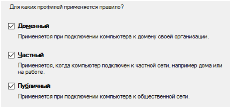 Следующим действием необходимо будет установить «Разрешить подключение» и отметить все три галочки в окне для применения правил к профилю.