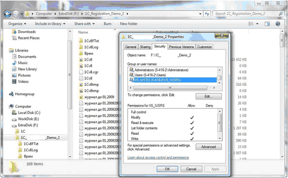 4) Выполним установку прав для обработчика web-сервисов 1С. Права на возможность запуска модулей добавляются для группы IIS_IUSRS на папку