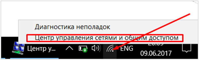 Для выяснения IP-адреса компьютера требуется открыть «Центр управления сетями и общим доступом» в правом нижнем углу рабочего стола.