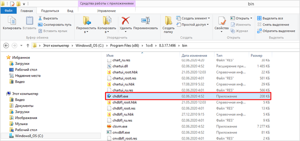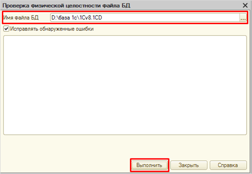 Также одним из способов устранения ошибок в программе является выполнение внешнего тестирования, используя файл платформы «chdbfl.exe», но применим он только для файлового режима базы.