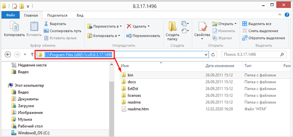 После успешного выполнения копирования базы, переходим непосредственно к выполнению «Внешнего тестирования», для этого необходимо перейти в папку, где находится платформа. Как правило, платформа устанавливается в «C:\Program Files\1cv8» или «C:\Program Files (x86)\1cv8», если версия 8.3, и C:\Program Files\1cv82, если версия 8.2. В каталоге с установленными версиями платформы находим ту версию платформы, с которой осуществляется запуск информационной базы, далее переходим в папку «bin» и открываем ее.