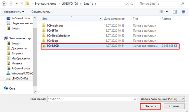Далее нужно поставить флажок «Исправлять обнаруженные ошибки» и в поле «Имя файла БД» вставляем путь расположения базы, нажимаем на клавишу F4 или «Выбрать» и выбираем непосредственно файл информационной базы «1Cv8.1CD» и нажимаем «Открыть».