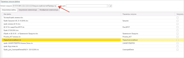 Если для какого-либо прайс-листа, который необходимо загрузить, автоматически не был подобран параметр загрузки (не заполнено значение в колонке «Параметры загрузки»), то его необходимо указать вручную, либо скорректировать значение поля «Имя файла содержит» в соответствующем элементе справочника «Параметры загрузки» (см. выше).