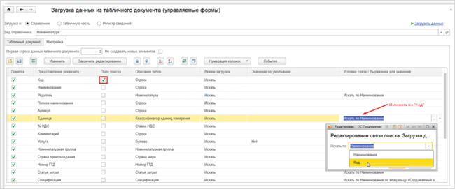 Программа изначально не знает, по какому полю ей искать элемент справочника на случай, если он там уже есть. Поэтому ей его нужно указать. Например, ищем по коду, так как он, как правило, уникален. В колонке «Поле поиска» в строке «Код» ставим галочку. Теперь, если запись с таким кодом будет найдена, она будет заменена, иначе создана.