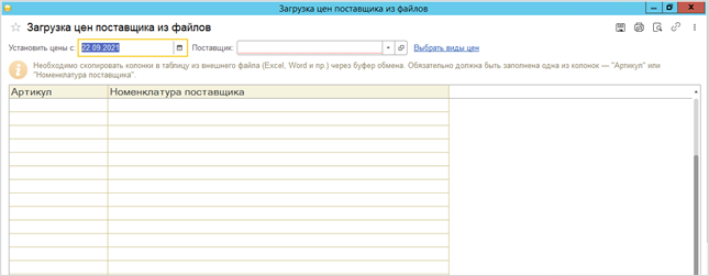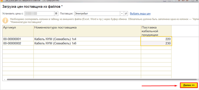 После выбора контрагента (поставщика) в таблице станут доступны дополнительные колонки для каждого типа цен.