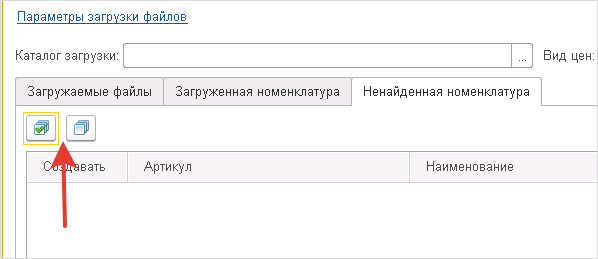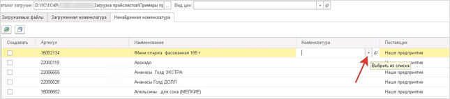 После прочтения файлов на данной вкладке отображается список номенклатуры, для которой не была найдена соответствующая номенклатура из текущей базы 1С.