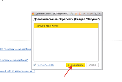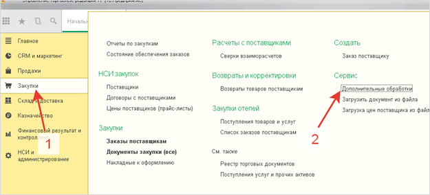 Для того чтобы открыть обработку, необходимо перейти в «Закупки» - «Дополнительные обработки» и выбрать в открывшемся окне «Загрузка прайс-листов».