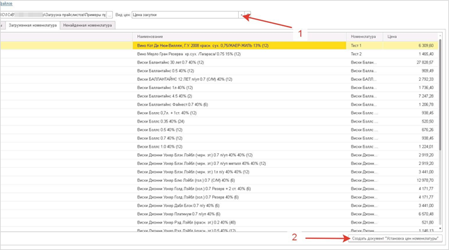 Также на вкладке доступна функция загрузки цен (создание документа «Установка цен номенклатуры»). Для этого необходимо указать вид загружаемых цен и нажать кнопку «Создать документ «Установка цен номенклатуры»».