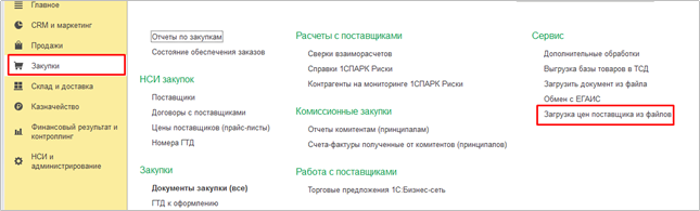 Рассмотрим более подробно работу типовой обработки по загрузке данных на примере Управление торговлей. Данным функционалом можно воспользоваться, открыв раздел «Закупки», в меню «Сервис», она носит наименование «Загрузка цен поставщика из файлов».