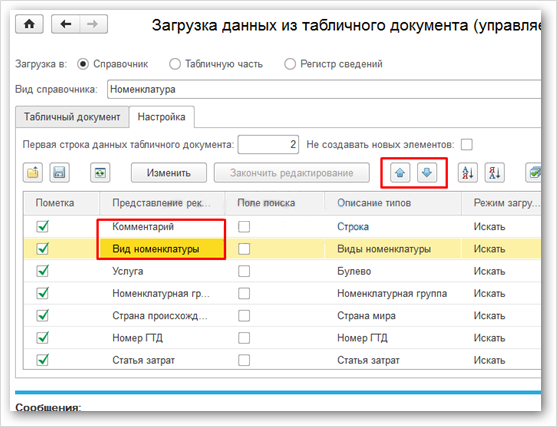 Еще одно важное замечание. Колонки в файле должны располагаться строго в том же порядке, как и строки полей справочника.А в примере «Вид номенклатуры» находится в самом низу, а в файле после колонки «Комментарий». Для того, чтобы поднять строку «Вид номенклатуры» вверх, существуют синие стрелочки вверху формы. С помощью стрелки «Вверх» поднимаем нужную строку и ставим под «Комментарием».