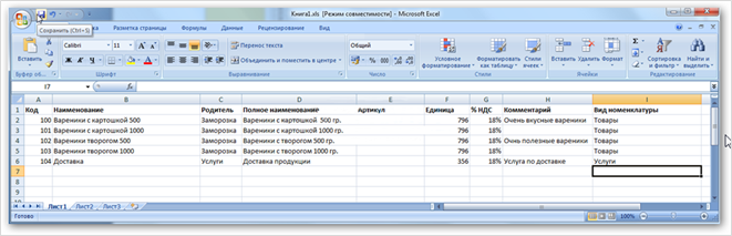 Вот так выглядит файл Excel с исходными данными, который мы будем загружать в справочник «Номенклатура»: